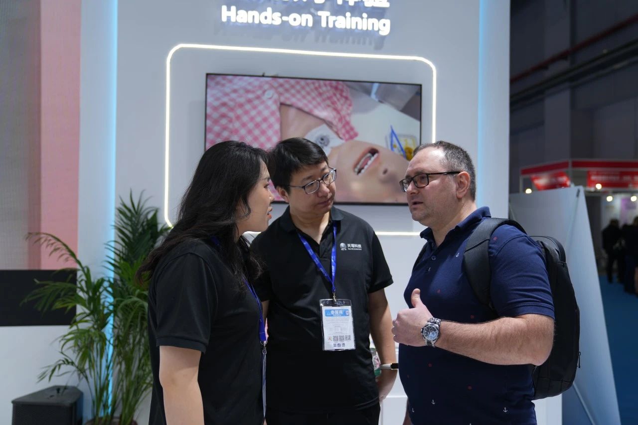 Focused on the Tellyes exhibition area, foreign guests showed great interest in the deep application of AI-based medical education platform and high-fidelity training system. After thoroughly understanding, they all gave consistent praise to the products.